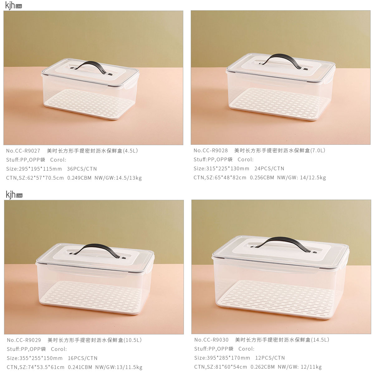 美時(shí)長(zhǎng)方形手提密封瀝水保鮮盒(4.5L/7.0L/10.5L/14.5L)