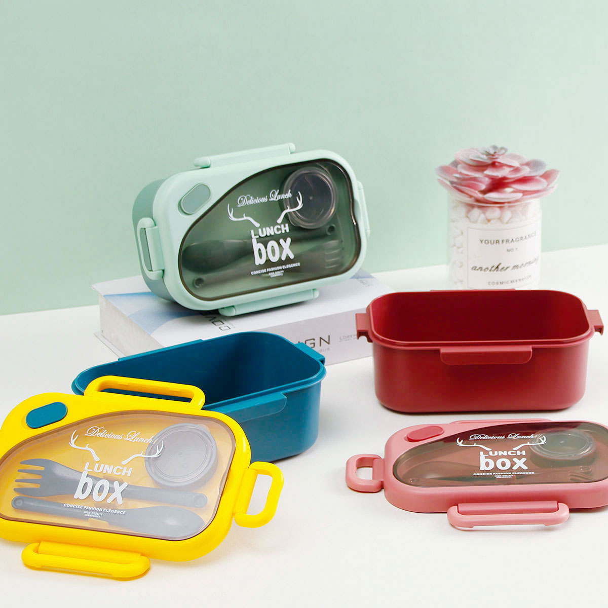 品悅長方單層密封飯盒(1000ml)(含醬料盒)+圓形/八角隨行杯(500ml)