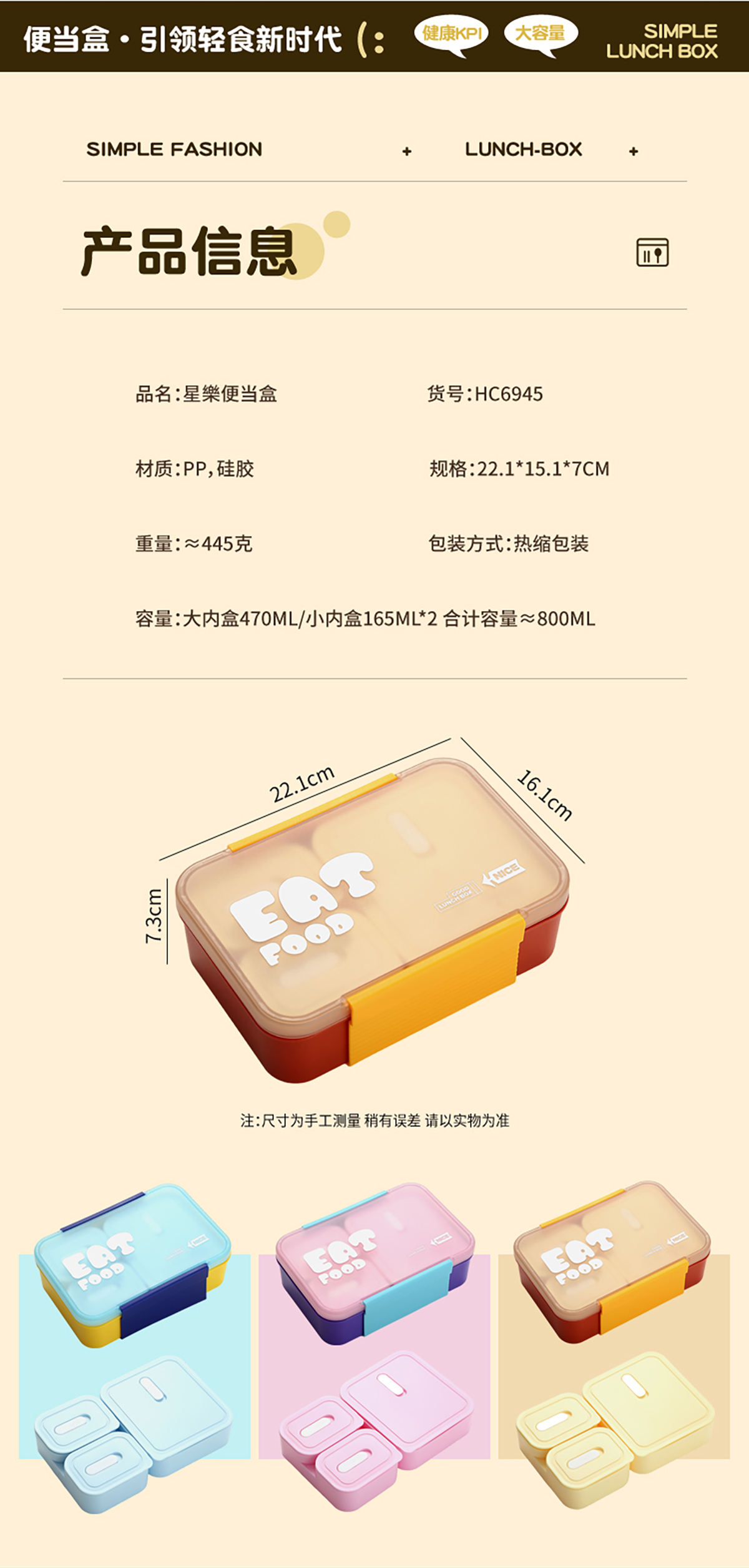 Size: 221*151*70mm/大內盒470ml/小內盒165ml*2
